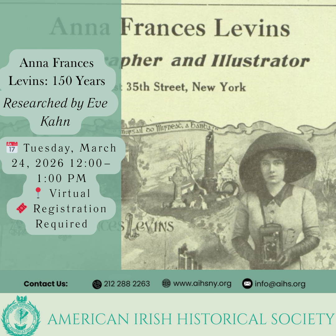Trailblazing photographer, publisher, artist and Irish independence activist Anna Francis Levins (1876-1941) has fallen into undeserved obscurity, which independent scholar Eve M. Kahn has set out to remedy based on archival treasures including in the American Irish Historical Society’s collection. This heavily illustrated talk will cover Levins’ work combating xenophobia, documenting Irish Americans dating back to Revolutionary […]