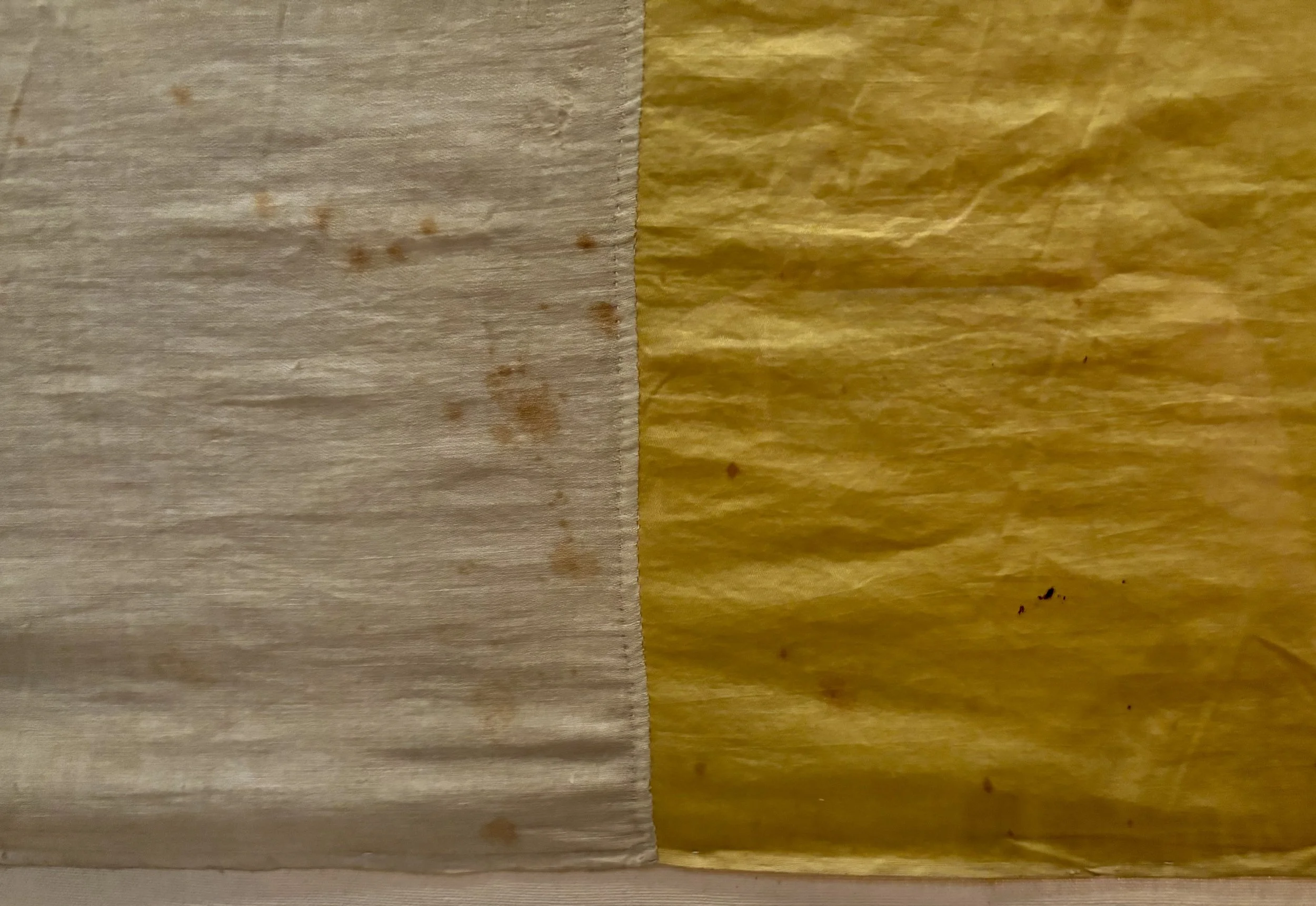 Bloodstains visible on the material hint at the "terrible beauty" born of the rebels’ sacrifice, which W. B. Yeats described in his poem; an estimated 485 people died fighting for Irish independence. Emblematically, the flag was captured by British forces, and housed only in private collections before finding its new home at AIHS.