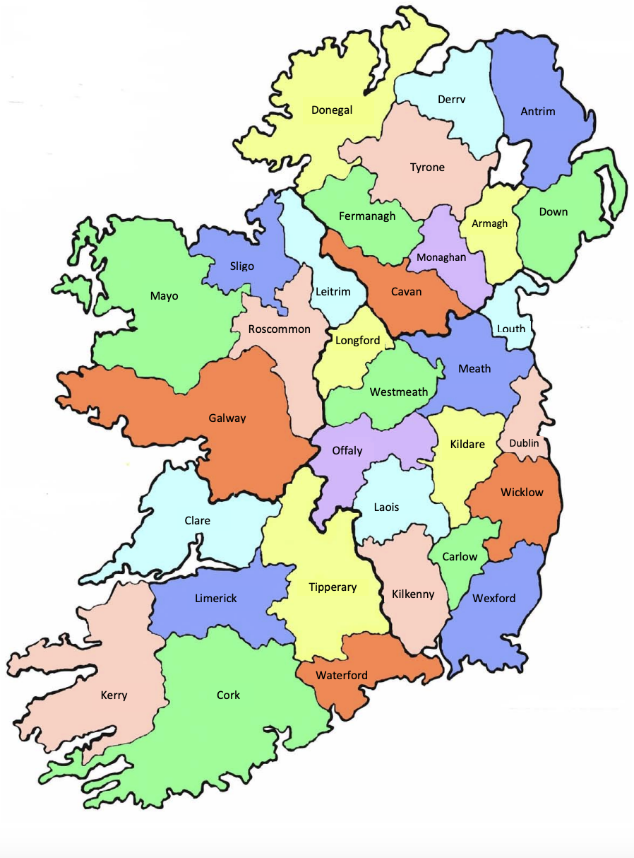 Map of the counties of Ireland, from Irish Genealogy Toolkit.