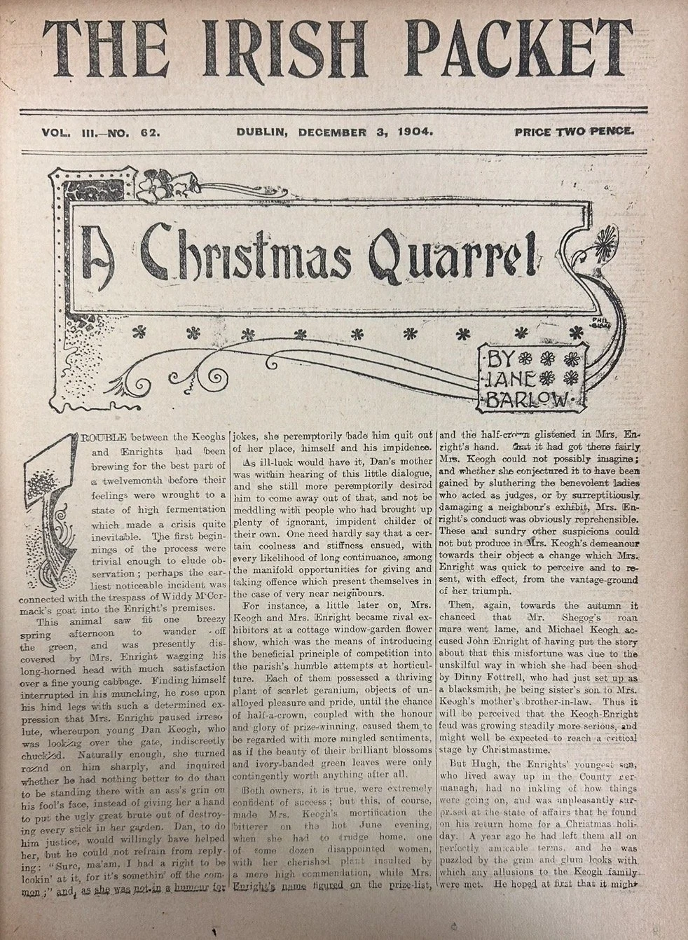 In this blog post, we will focus instead on a work by one of his published authors. Jane Barlow (1856-1917) was an acclaimed Irish author frequently featured in Bodkin’s Packet. Her works were primarily concerned with tales of the Irish peasantry, especially in a post-Famine setting. Though her writing was focused on her Irish background, she was a scholar of the world, traveling and learning other European languages to expand her scope. With this noted brilliance, she became one of the first women a doctorate from Trinity College Dublin, shortly after they first began granting women degrees at all.