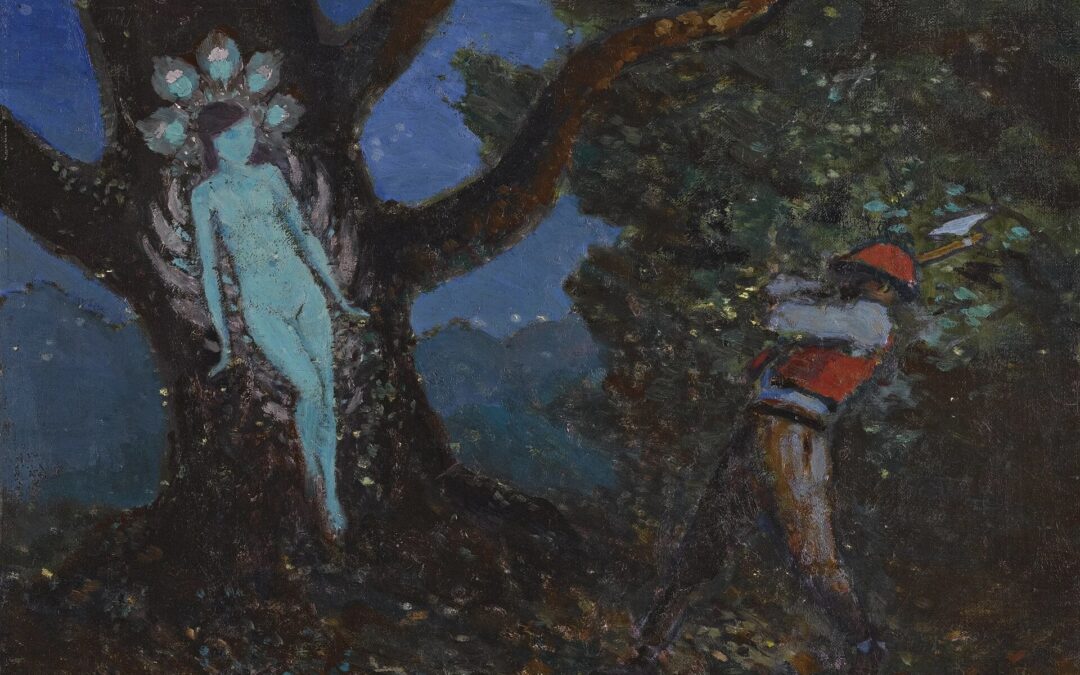 Russell’s mystical visions took inspiration from Irish folklore primarily in his depiction of the fae, as shown above. These works of folklore come from oral and written tales across Ireland, and were hugely impactful from his earliest childhood memories. In our collections, the fae remain hidden in the distance, looming out of sight. But in the dark nights on the second floor, the light may reveal some hidden secrets…